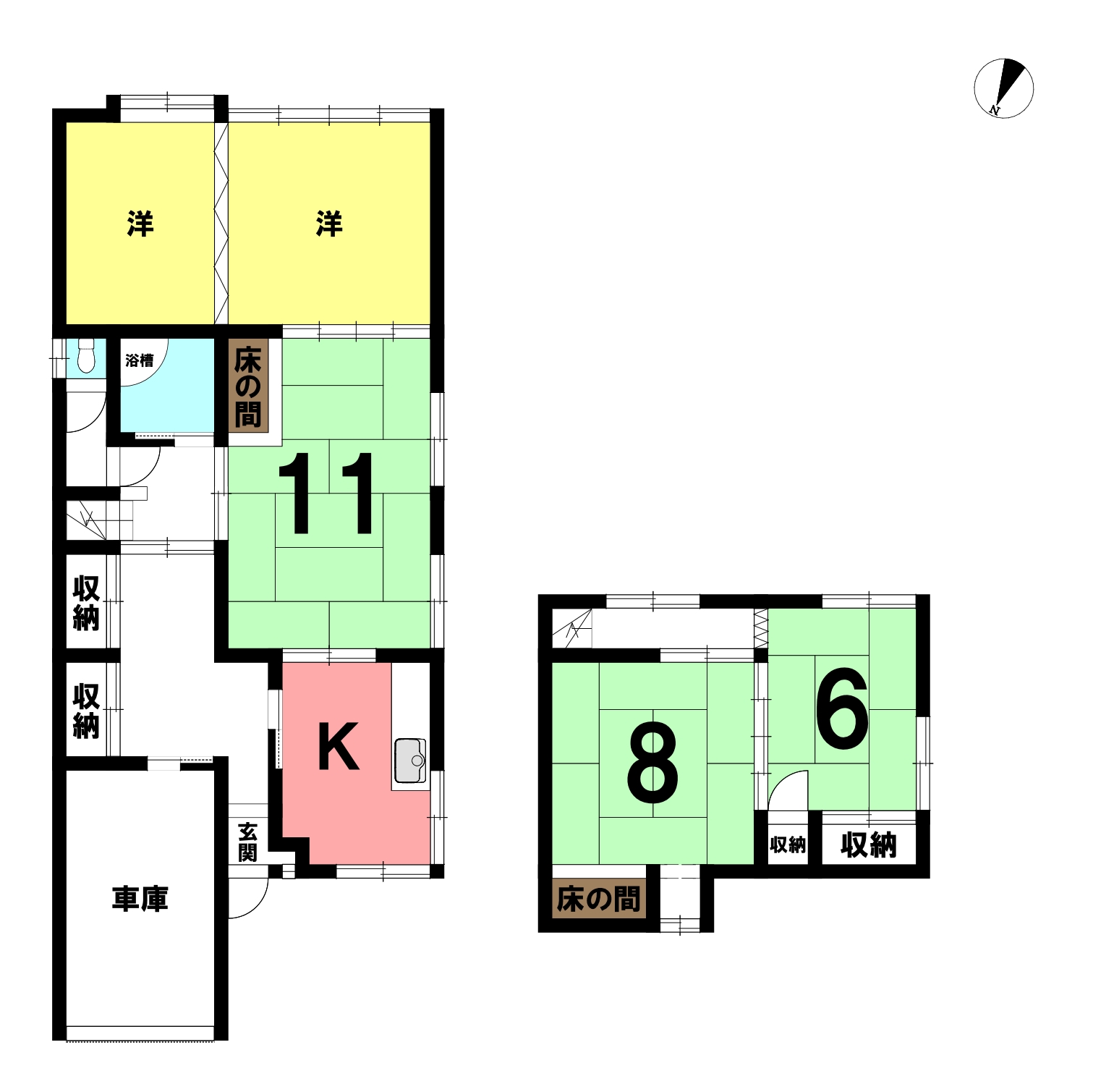 | 間取内訳 | 1階:K 洋室×2 和室11帖 2階:和室8帖 6帖 | ||