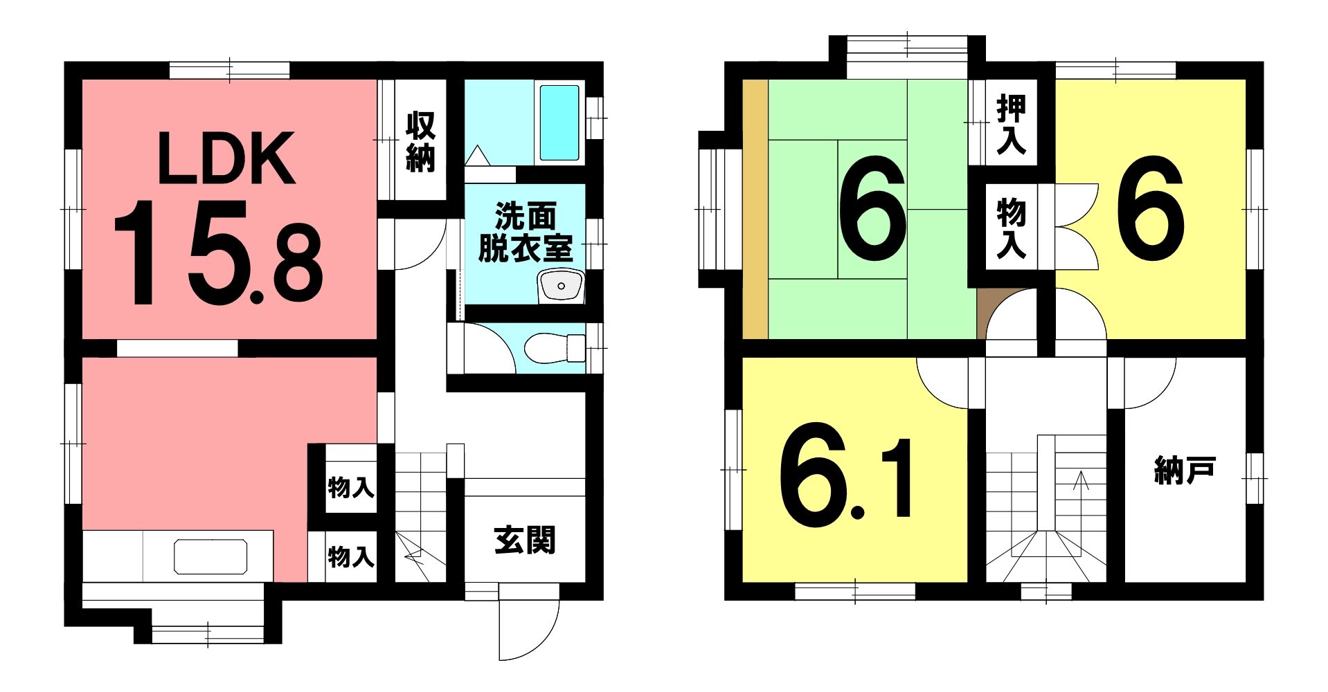 | 間取内訳 | 1階:LDK15.8帖 2階:和室6帖、洋室6帖、6.1帖 | ||