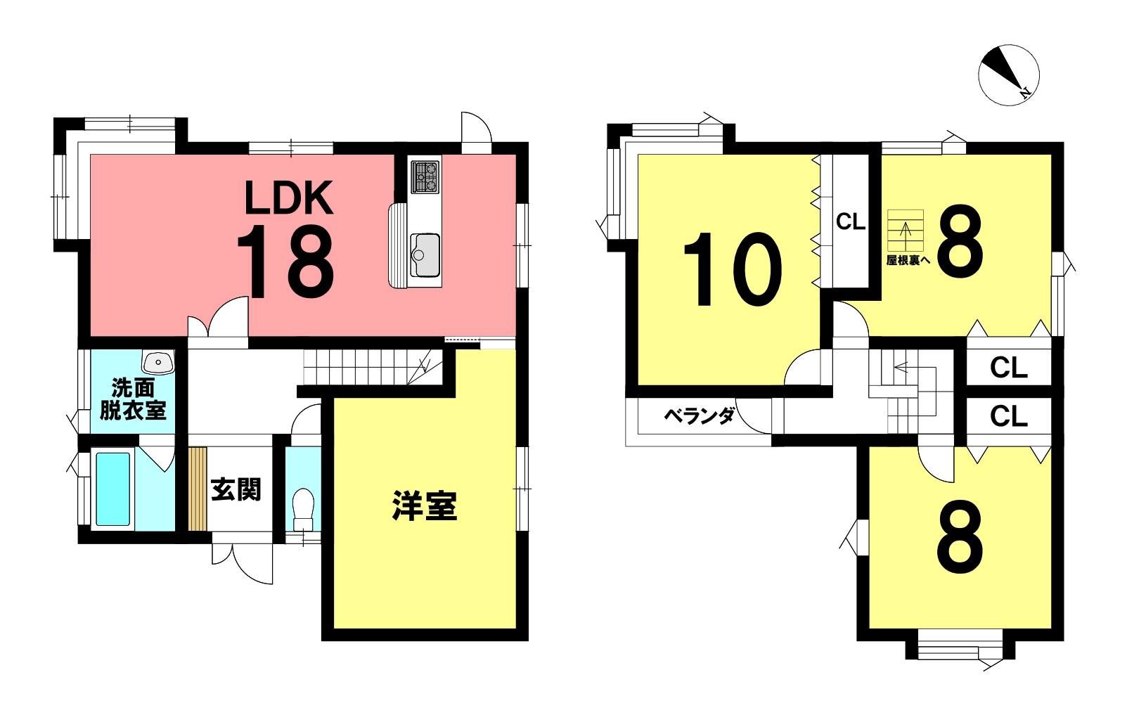 | 間取内訳 | 1階:LDK18帖、洋室 2階:洋室10帖、8帖×2 | ||