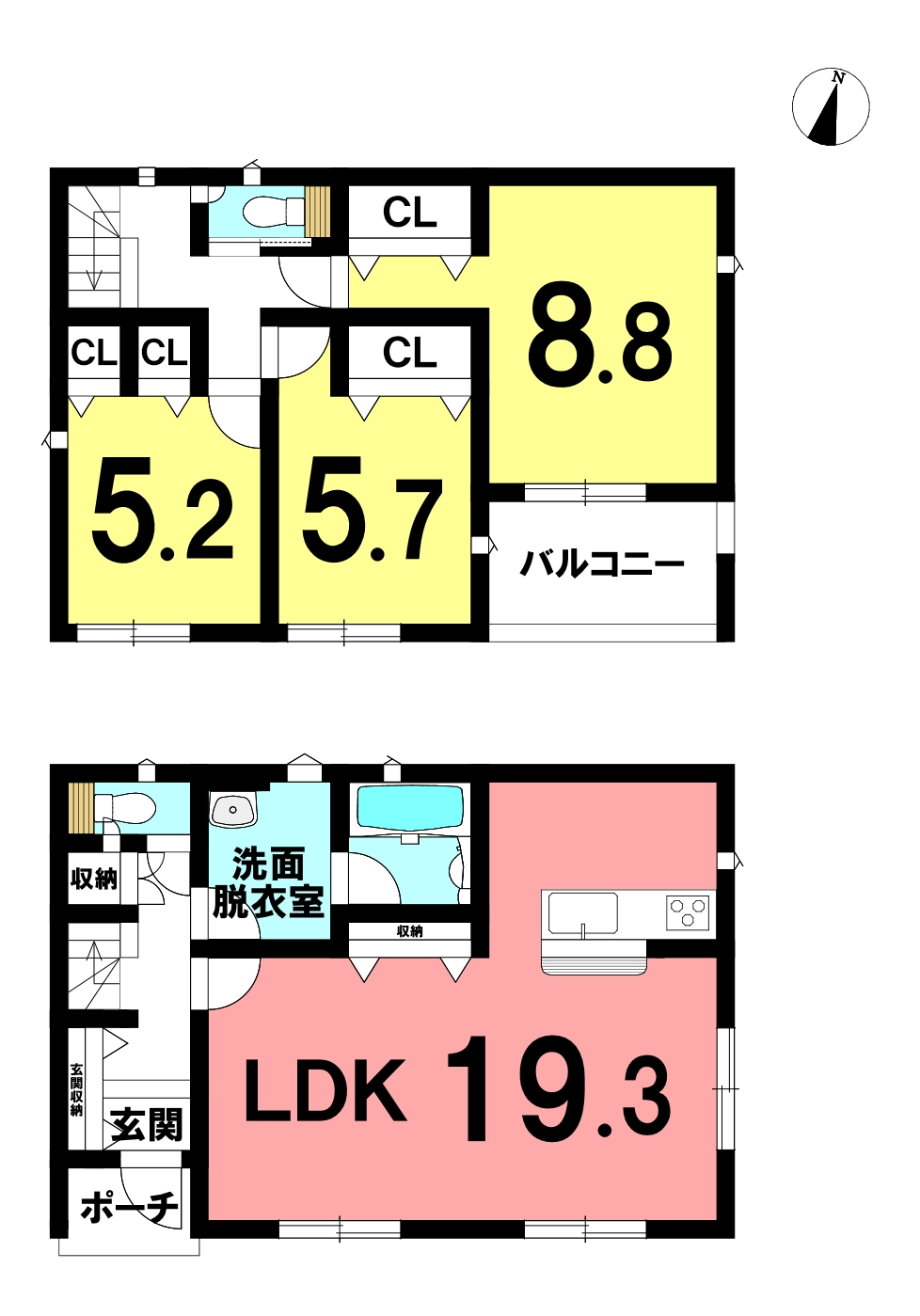 | 間取内訳 | 1階:LDK19.3帖 2階:洋室8.8帖 5.7帖 5.2帖 | ||