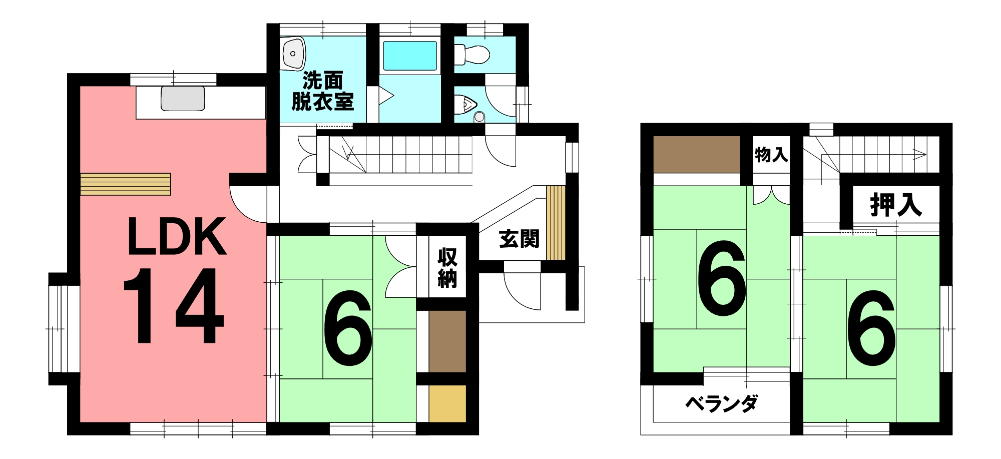 | 間取内訳 | 1階:LDK14帖、和室6帖 2階:和室6帖×2 | ||