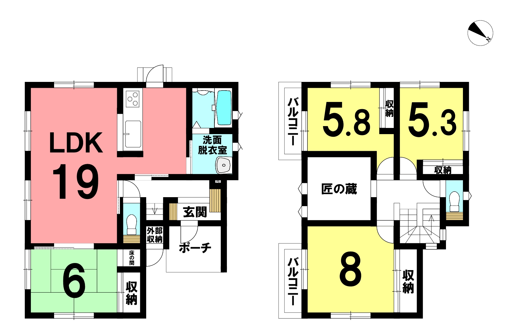 | 間取内訳 | 1階:洋室7帖 4.5帖×2 2階:LDK16.5帖 | ||