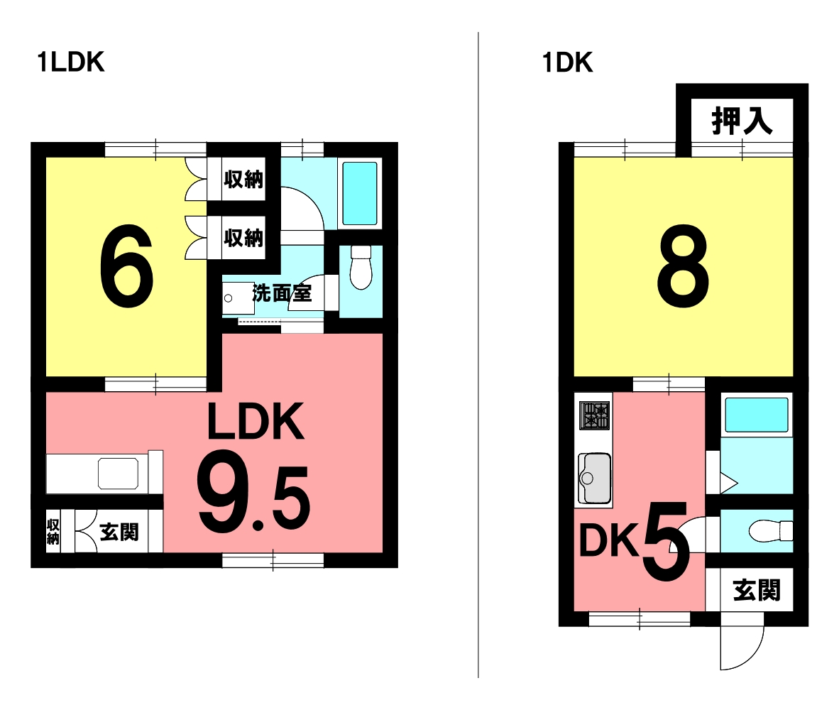 | 間取内訳 | 1LDK:LDK9.5帖、洋室6帖 1DK:DK5帖、洋室8帖 | ||