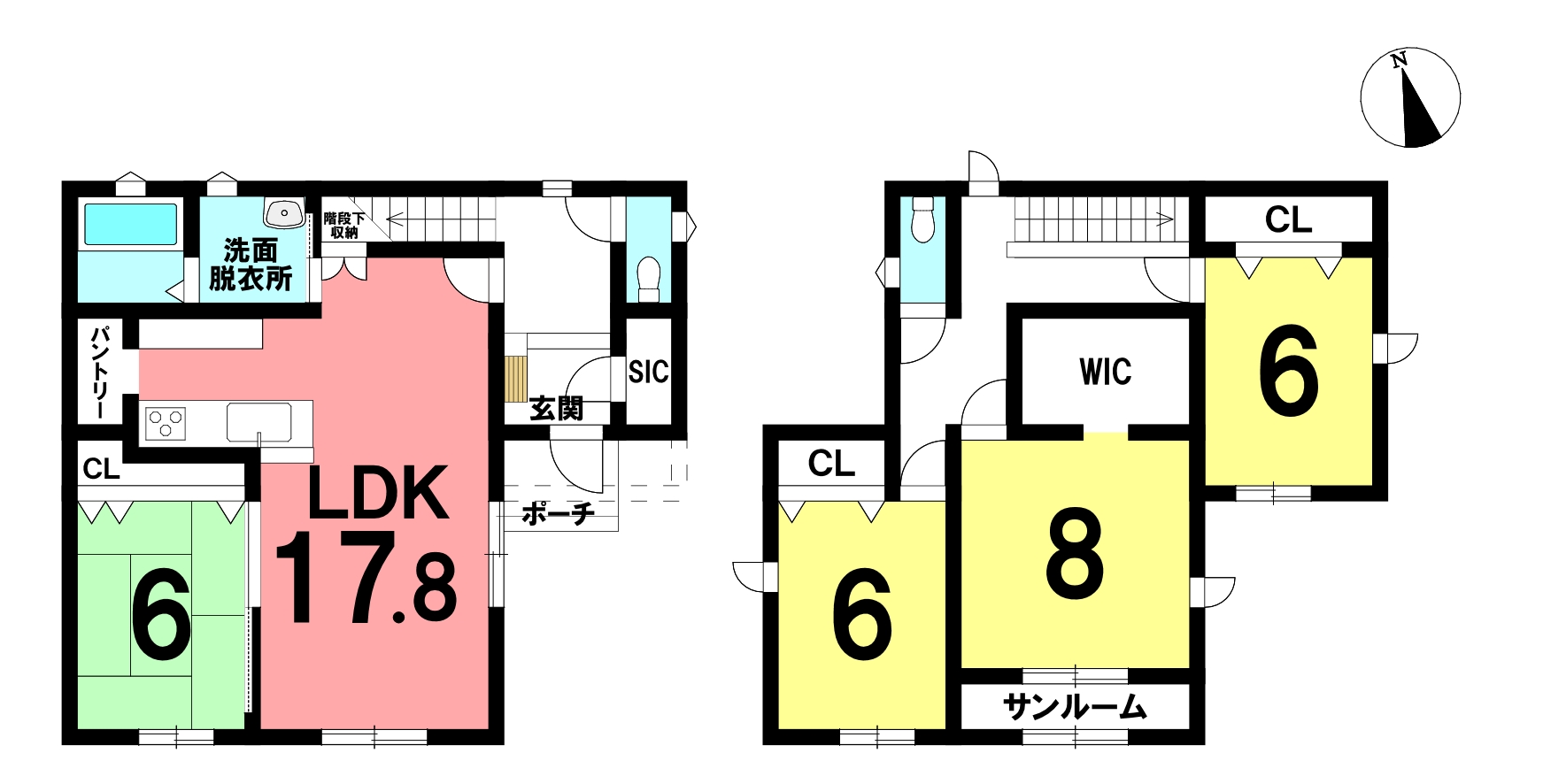 | 間取内訳 | 1階:LDK17.8帖、和室6帖 2階:洋室8帖、6帖×2 | ||