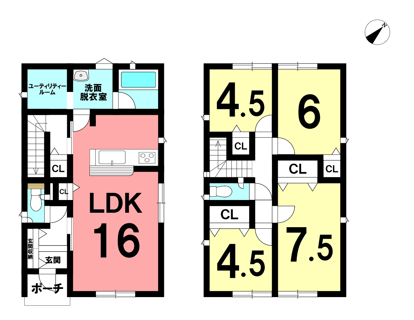 | 間取内訳 | 1階:LDK16帖 2階:洋室7.5帖、6帖、4.5帖、4.5帖 | ||