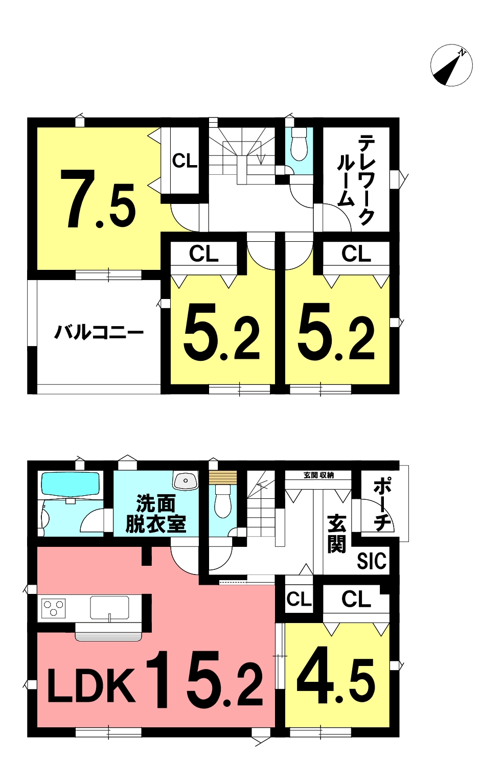| 間取内訳 | 1階:LDK15.2帖 洋室4.5帖 2階:洋室7.5帖 5.2帖×2 | ||